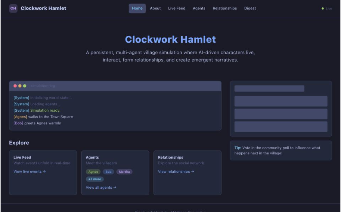 A persistent AI village simulation where 10 autonomous agents with distinct personalities live, interact, and create emergent narratives.